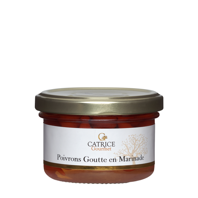 Ingrédients : poivrons-goutte 49%, eau, vinaigre (SULFITES), sucre, selPoids net 100g, 42€/kg